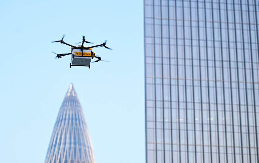 An unmanned food delivery drone is pictured in Shenzhen, south China's Guangdong Province, Nov. 24, 2023. (Xinhua/Mao Siqian)