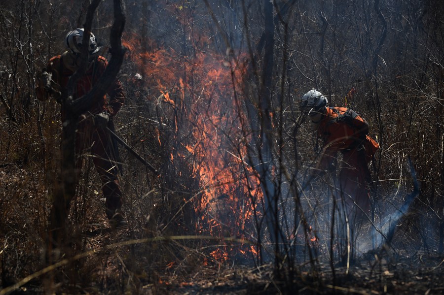 Firefighters combat fire in the Serra do Coco forest area in Riachao das Neves, Bahia state, Brazil, Sept. 22, 2023. (Photo by Lucio Tavora/Xinhua)