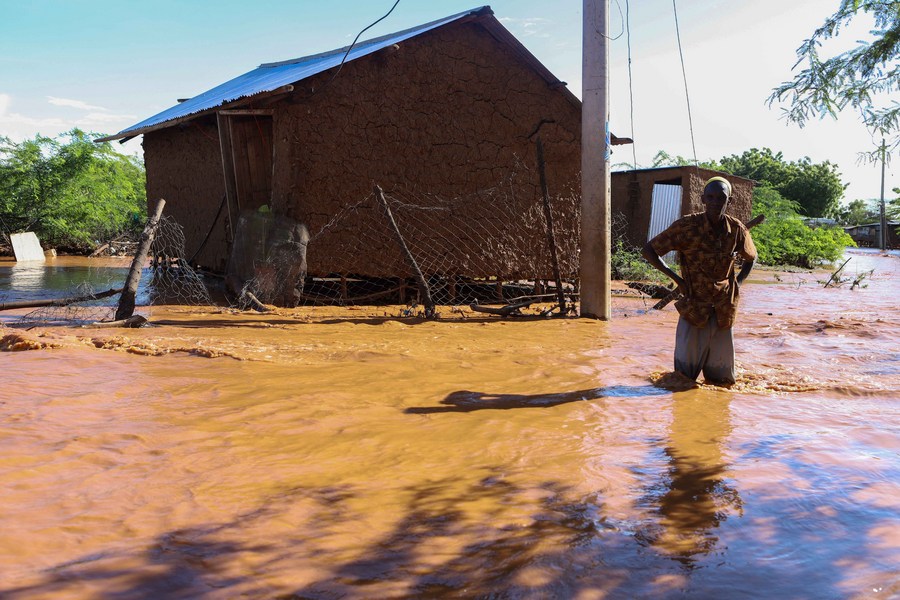 A man stands next to his flooded house after a heavy downpour in Garissa County, Kenya, on Nov. 22, 2023. (Photo by Joy Nabukewa/Xinhua)