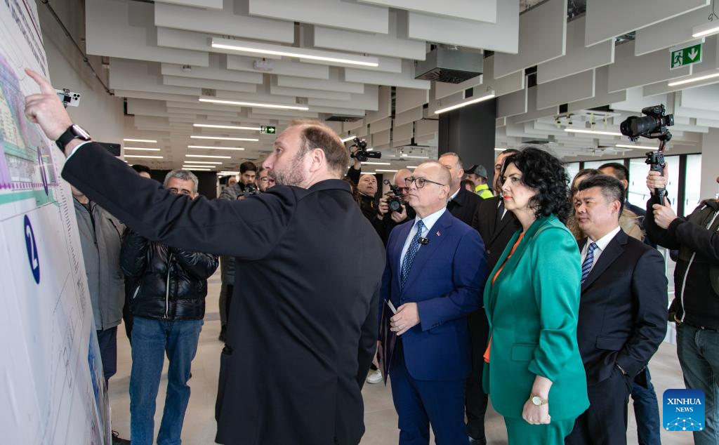 Serbian Minister of Construction, Transport and Infrastructure Goran Vesic (C) looks at a presentation for the expansion of Serbia's Konstantin Veliki Airport in Nis, southeastern Serbia, on March 19, 2024. Serbia's Konstantin Veliki Airport in the southeast city of Nis is set for expansion after an infrastructure development contract was awarded to China's Shandong Hi-Speed Group on Tuesday. (Photo by Wang Wei/Xinhua)