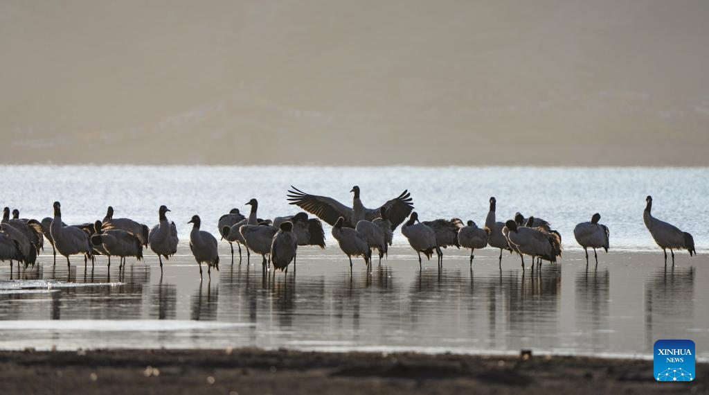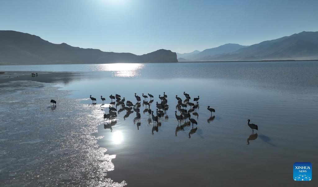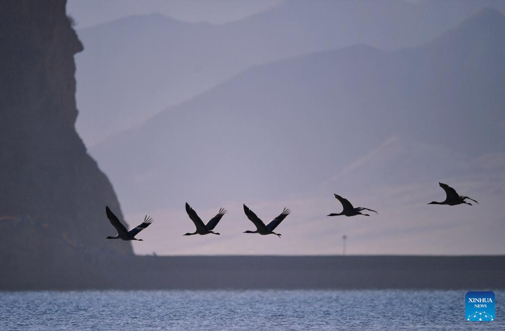 Black-necked cranes are seen at a reservoir in Lhunzhub County of Lhasa, southwest China's Xizang Autonomous Region, March 17, 2024. As the temperature gradually rises, black-necked cranes have started their migration from the reservoir in Lhunzhub County. The black-necked crane, a species under first-class state protection in China, mainly inhabits plateau meadows and marshes at an altitude of 2,500 to 5,000 meters. (Xinhua/Jigme Dorje)