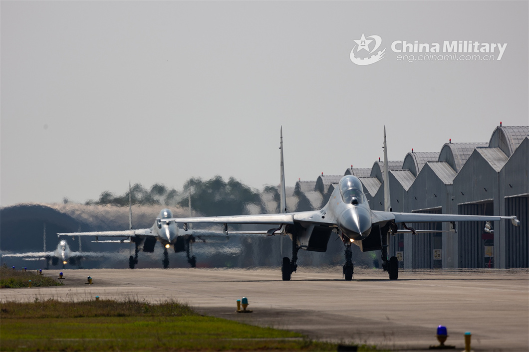 Fighter jets attached to a naval aviation unit under the PLA Southern Theater Command taxi on the flightline in formation during a flight training exercise on March 1, 2024. (eng.chinamil.com.cn/Photo by Fu Jinquan)