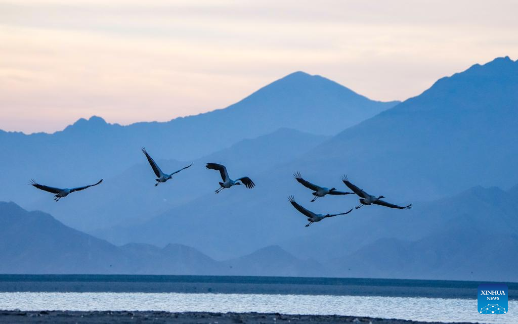 Black-necked cranes fly at a reservoir in Lhunzhub County of Lhasa, southwest China's Xizang Autonomous Region, March 17, 2024.