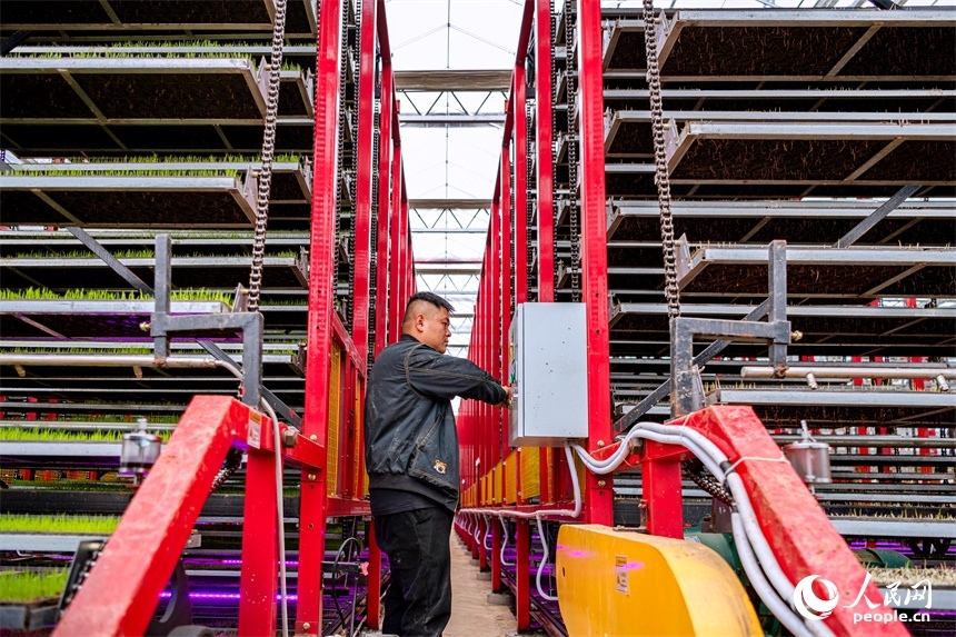 A worker cultivates early-season rice seedlings at an intelligent seedling breeding center in Hengshi town, Nankang district, Ganzhou, east China's Jiangxi Province. (People's Daily Online/Zhu Haipeng)