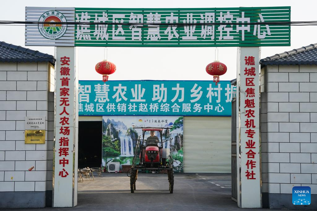 A self-driving machine sprays herbicides in a field at the smart farm at Shuanglou Village, Bozhou City of east China's Anhui Province, March 19, 2024. By introducing IT technologies like Internet of Things, Big Data and Artificial Intelligence, Jiao Rui, a young farmer born in the 1990s, has set up a smart decision making system on his farm which greatly improved the production efficiency. (Xinhua/Du Yu)