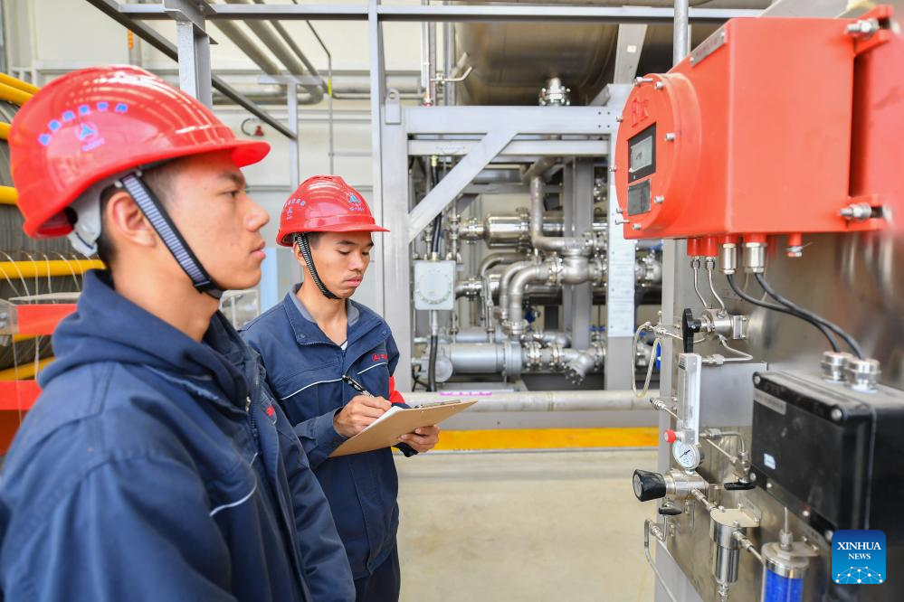 Staff workers inspect the storage area at the hydrogen production and distribution station of Sany Group in Changsha, capital of central China's Hunan Province, March 20, 2024. (Xinhua/Chen Zeguo)