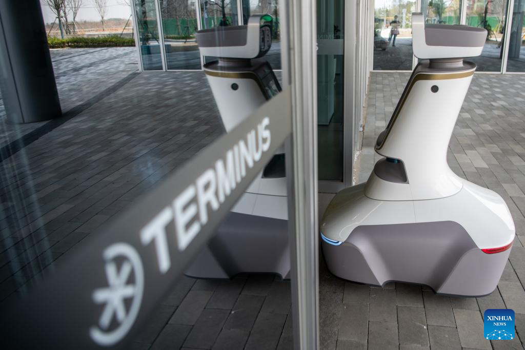 A robot works in an industrial park of Terminus Technologies in the Sino-French Wuhan Ecological Demonstration City in Wuhan, central China's Hubei Province, March 19, 2024. This year marks the 10th anniversary since China and France signed the agreement to build the Sino-French Wuhan Ecological Demonstration City. The eco city, covering an area of 39 square kilometers, has integrated Chinese and French ecological urban construction concepts and is rising as a popular region for residents and companies. (Xinhua/Wu Zhizun)