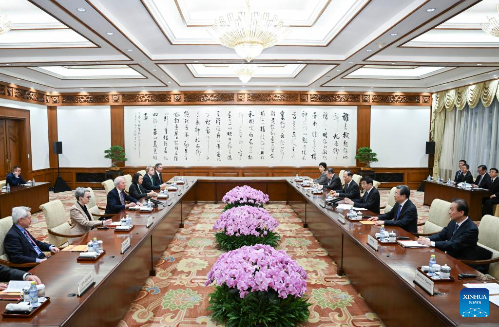 Wang Huning, chairman of the National Committee of the Chinese People's Political Consultative Conference, also a member of the Standing Committee of the Political Bureau of the Communist Party of China Central Committee, meets with a delegation of members of the UK Parliament from the Conservative Party and the Labour Party, who came to China for the 12th China-UK Leadership Forum, in Beijing, capital of China, March 21, 2024. (Xinhua/Zhang Ling)
