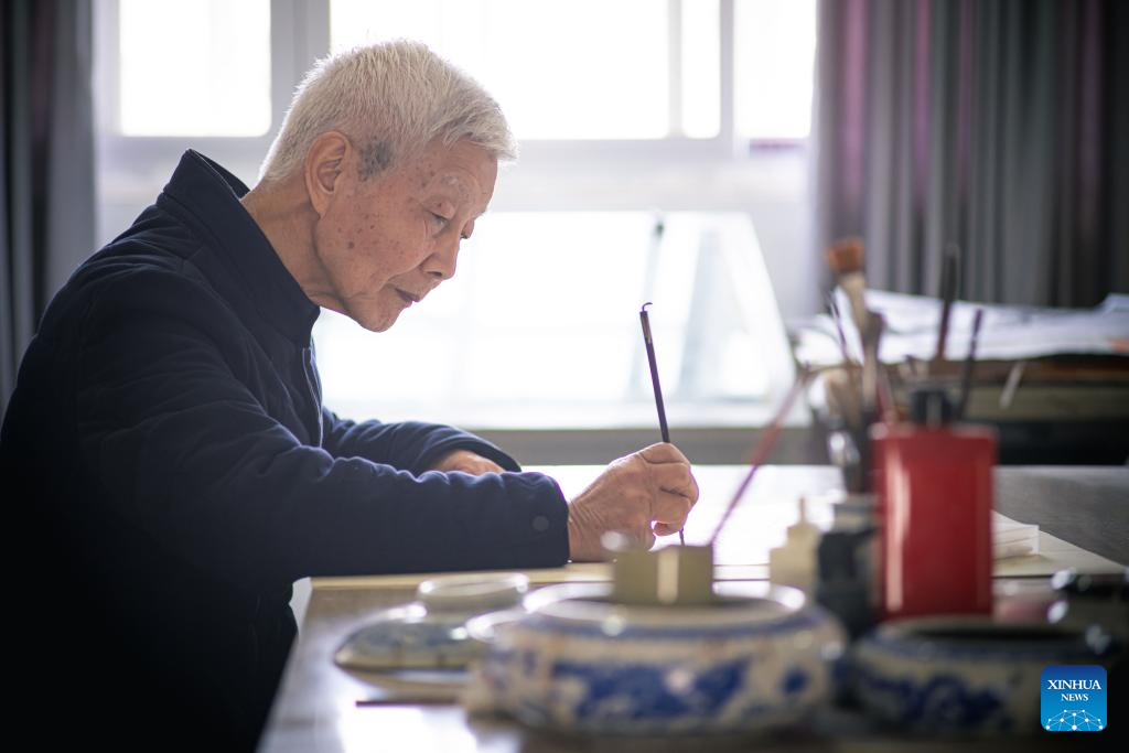 Lu Faliang designs a pattern of paper knife cutting themed on the city view at his studio in Yueqing City, east China's Zhejiang Province, March 12, 2024.(Xinhua/Jiang Han)
