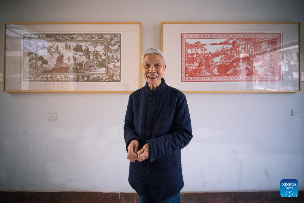 Lu Faliang poses for a photo with his paper knife cuttings at his studio in Yueqing City, east China's Zhejiang Province, March 12, 2024.(Xinhua/Jiang Han)