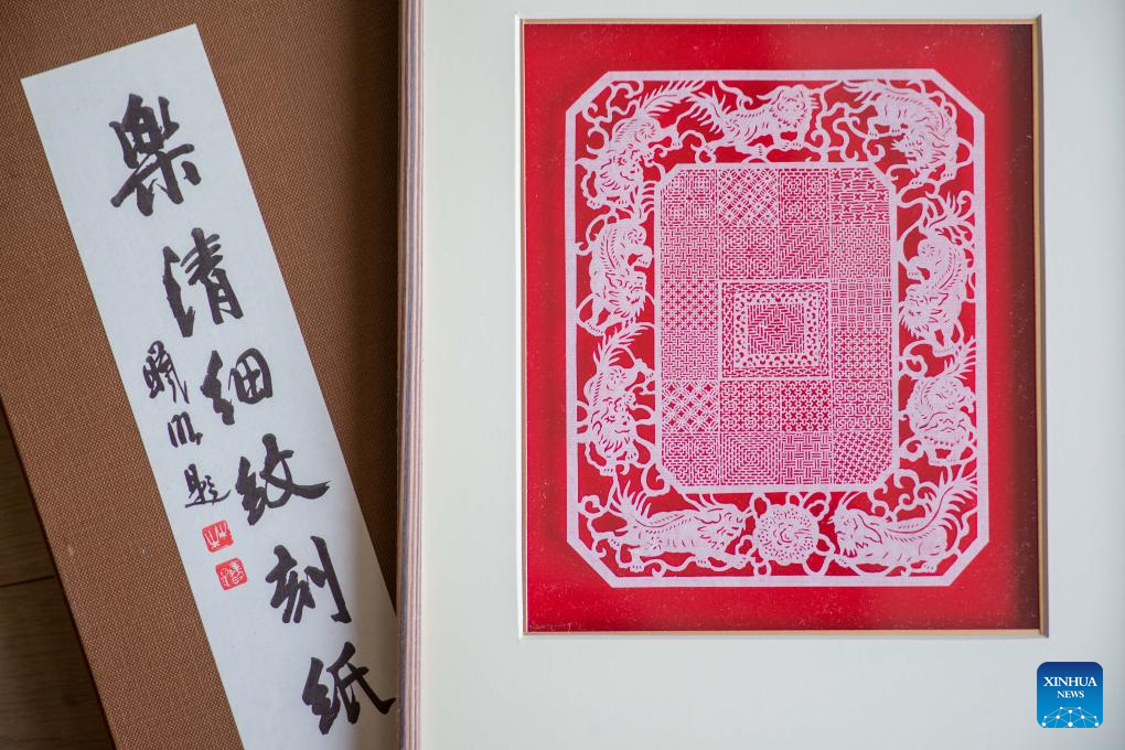 Lu Faliang mounts a paper knife cutting at his studio in Yueqing City, east China's Zhejiang Province, March 12, 2024.(Xinhua/Jiang Han)