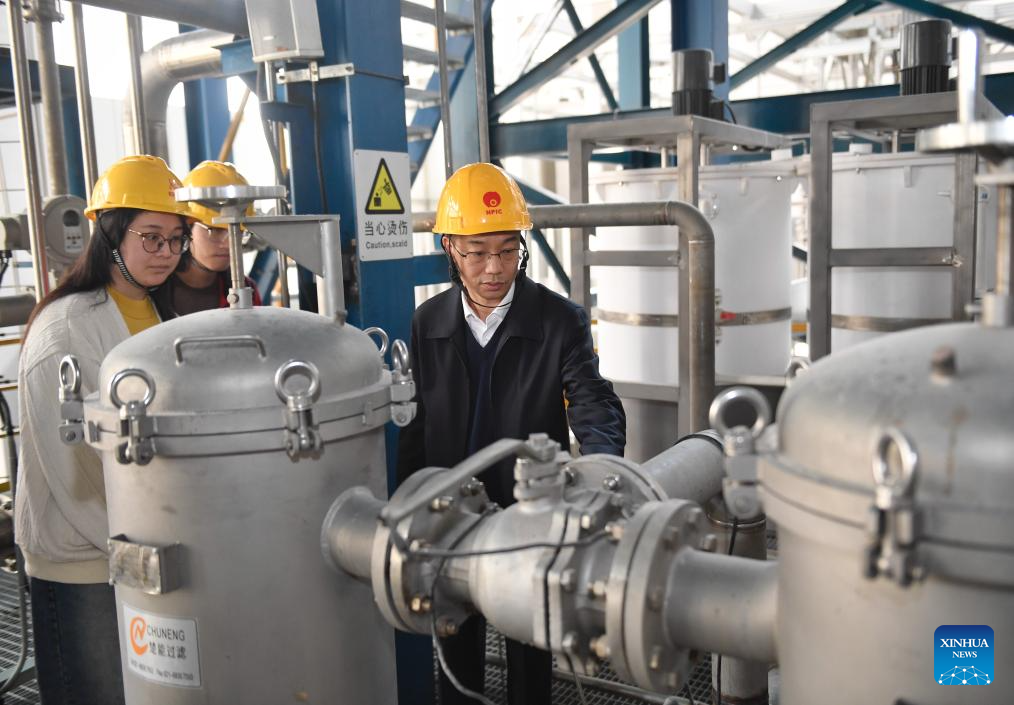 Song Danrong (R), chief designer of Linglong One, inspects with team members on an experimental platform for Linglong One, in Nuclear Power Institute of China in Chengdu, southwest China's Sichuan Province, March 14, 2024. The construction of Linglong One in Hainan Province has gone smoothly. (Xinhua/Liu Kun)