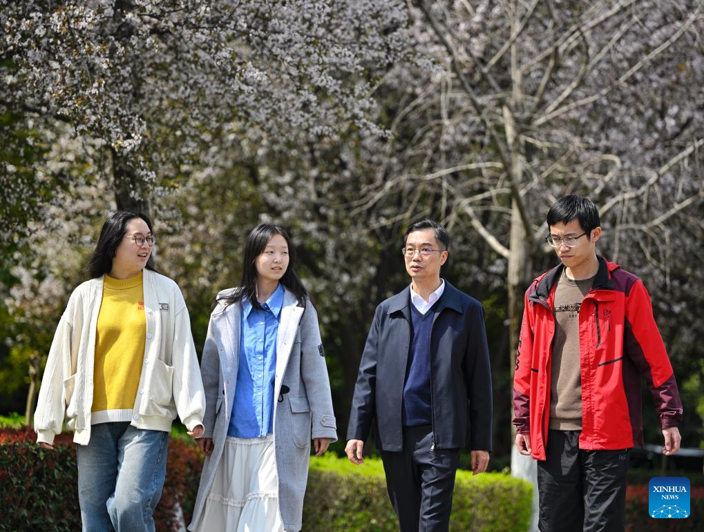 Song Danrong (2nd R), chief designer of Linglong One, walks with team members in Nuclear Power Institute of China in Chengdu, southwest China's Sichuan Province, March 14, 2024. (Xinhua/Liu Kun)