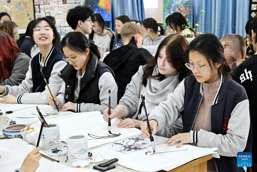 Chinese and German students experience Chinese painting in Qingdao No. 9 High School in Qingdao, east China's Shandong Province, March 21, 2024. High school students from Magdeburg of Germany, who paid a friendly visit to Qingdao No. 9 High School in Shandong Province, experienced making artworks of China's intangible cultural heritages and learned about traditional Chinese culture with Chinese students. (Xinhua/Li Ziheng)
