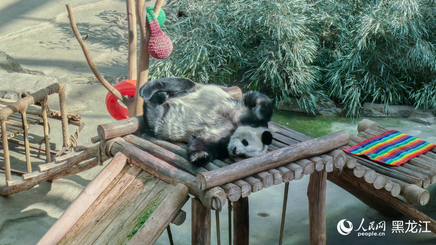 A panda enjoys a comfortable life at Yabuli Panda House in northeast China's Heilongjiang Province. (People's Daily Online/Xu Chenglong)
