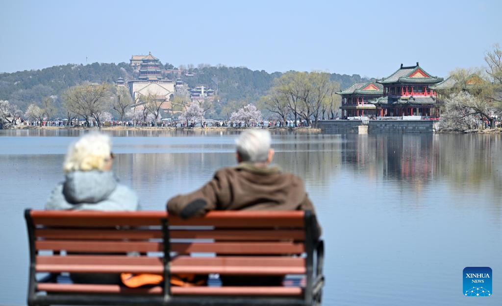 People rest on a bench at the Summer Palace in Beijing, capital of China, March 22, 2024. Recently, spring flowers such as peach blossoms are in full bloom at the Summer Palace in Beijing, attracting a large number of tourists. (Xinhua/Chen Yehua)