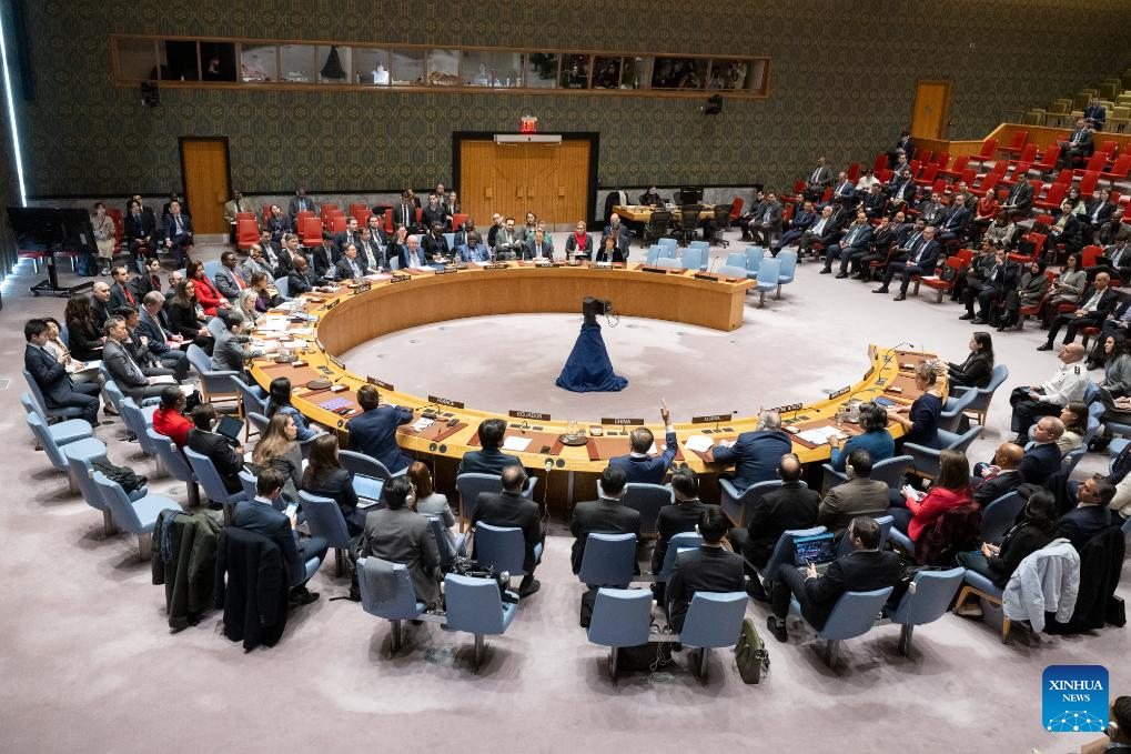Representatives vote on a draft resolution during a UN Security Council meeting at the UN headquarters in New York, on March 22, 2024. A Chinese envoy said Friday that by setting preconditions for a ceasefire in Gaza, a U.S. draft resolution essentially green-lights continued killing, which is "unacceptable." (Evan Schneider/UN Photo/Handout via Xinhua)
