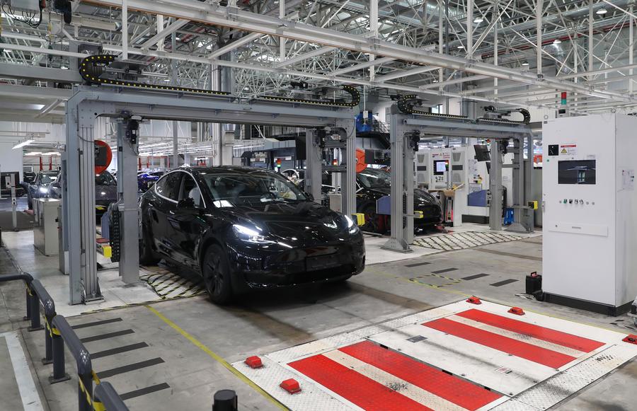 A Tesla electric vehicle undergoes electronic equipment testing before delivery at Tesla's Shanghai Gigafactory in east China's Shanghai, Dec. 22, 2023. (Xinhua/Fang Zhe)