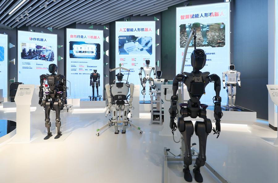 This photo taken on Nov. 29, 2023 shows robots displayed at an exhibition on sci-tech innovations in east China's Shanghai. (Xinhua/Fang Zhe)