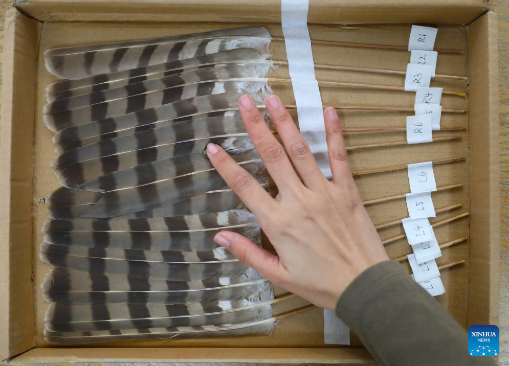 Meng Die splices feathers for an injured sparrow hawk at Shenyang Raptor Rescue Center in Shenyang, northeast China's Liaoning Province, March 23, 2024. (Xinhua/Yang Qing)