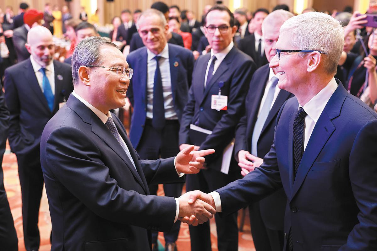 Premier Li Qiang shakes hands on Sunday with Apple CEO Tim Cook after the opening ceremony of the China Development Forum 2024 in Beijing. FENG YONGBIN / CHINA DAILY