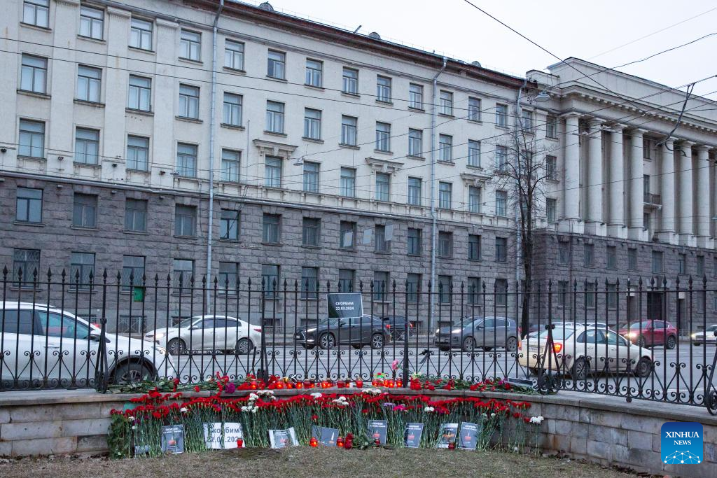 People lay flowers to commemorate victims of Moscow terrorist attack in St. Petersburg, Russia, March 23, 2024. (Photo by Irina Motina/Xinhua)