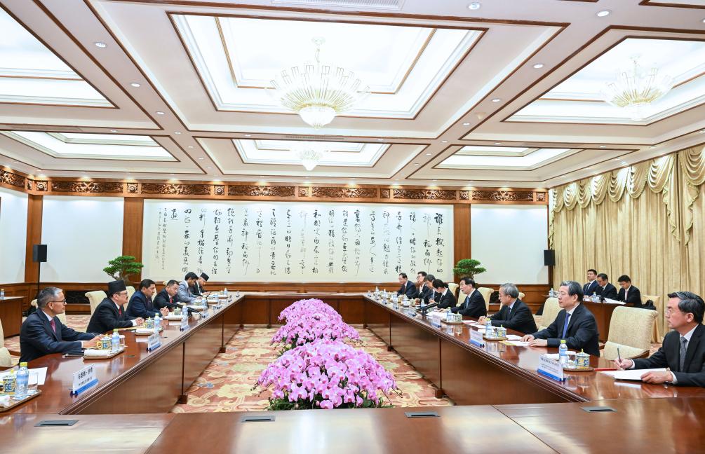 Wang Huning, a member of the Standing Committee of the Political Bureau of the Communist Party of China Central Committee and chairman of the National Committee of the Chinese People's Political Consultative Conference (CPPCC), meets with Narayan Kaji Shrestha, Nepal's deputy prime minister and foreign minister, in Beijing, capital of China, March 25, 2024. (Xinhua/Rao Aimin)