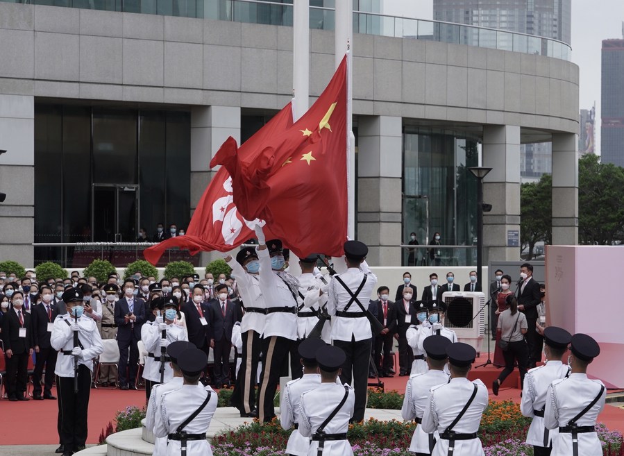 A flag-raising ceremony is held at the Golden Bauhinia Square by the Hong Kong Special Administrative Region (HKSAR) government to celebrate the 24th anniversary of Hong Kong's return to the motherland in Hong Kong, south China, July 1, 2021. (Xinhua/Lui Siu Wai)