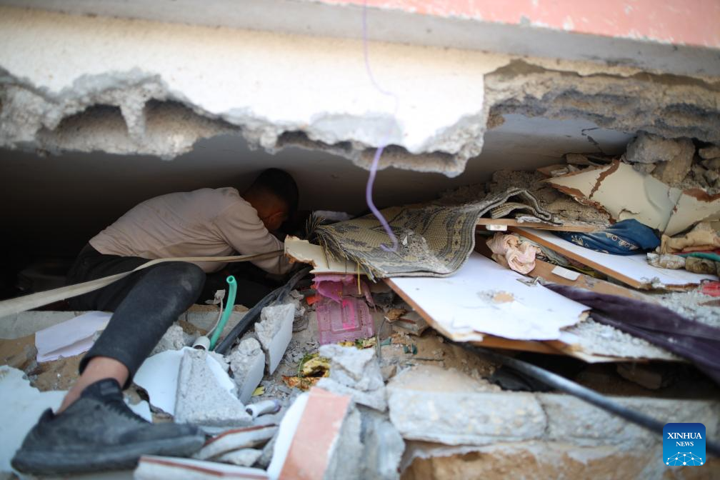 A man searches among the rubble after Israeli strikes in central Gaza Strip city of Deir el-Balah, on March 25, 2024. The Palestinian death toll in the Gaza Strip from ongoing Israeli attacks has risen to 32,333, the Hamas-run Health Ministry said in a press statement on Monday. (Xinhua)