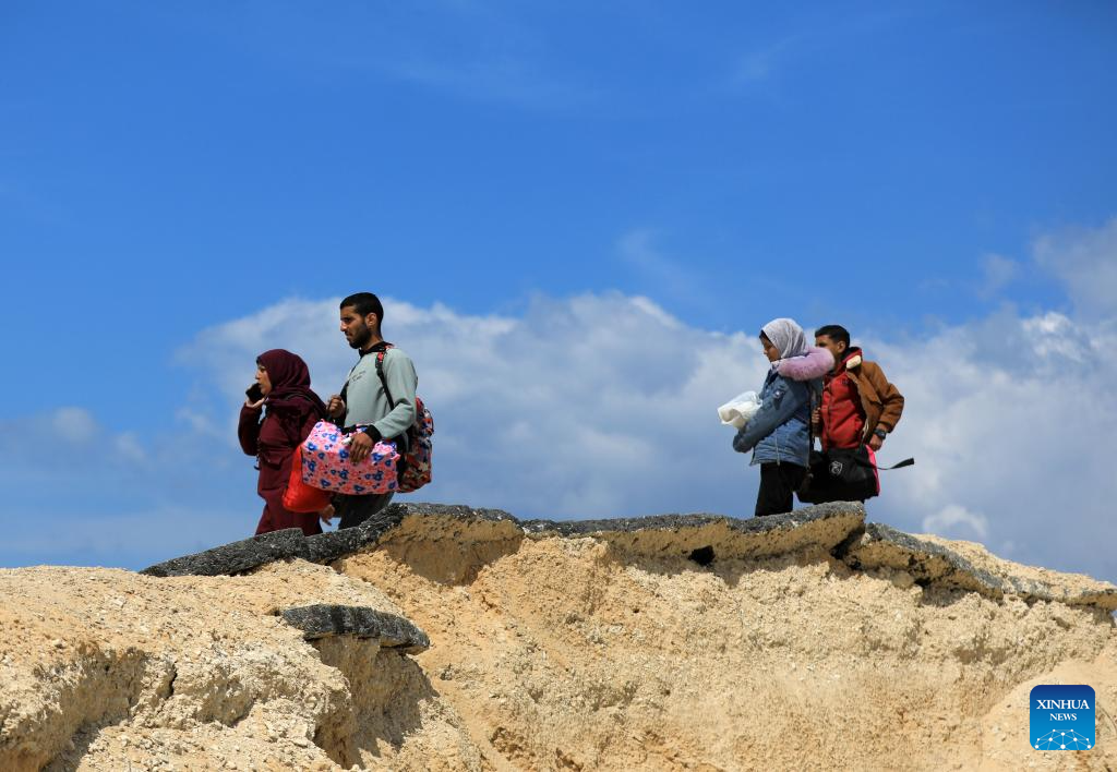 Palestinians fleeing from Gaza City arrive in the central Gaza Strip, on March 25, 2024. The Palestinian death toll in the Gaza Strip from ongoing Israeli attacks has risen to 32,333, the Hamas-run Health Ministry said in a press statement on Monday. (Photo by Yasser Qudih/Xinhua)