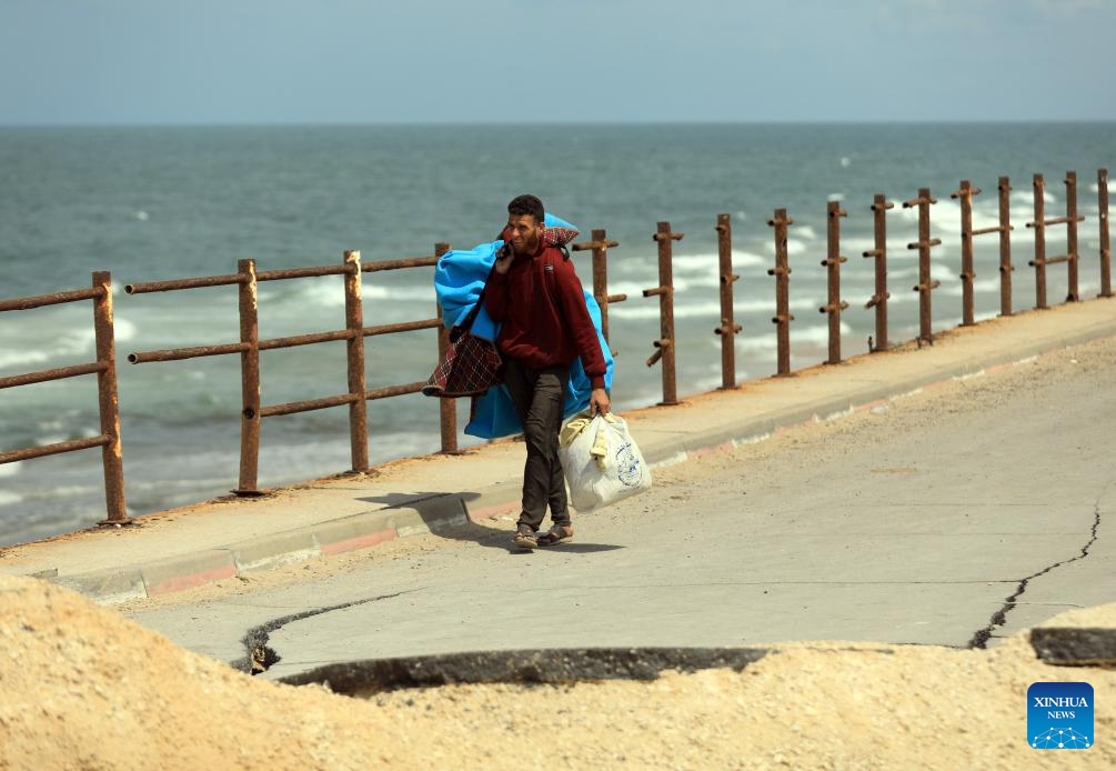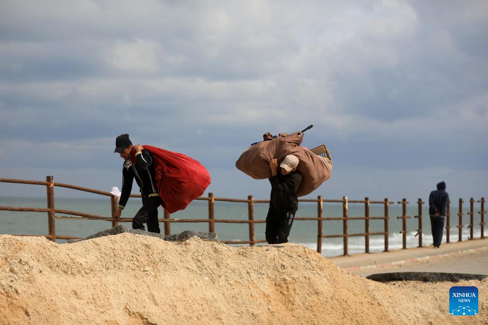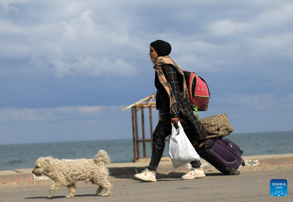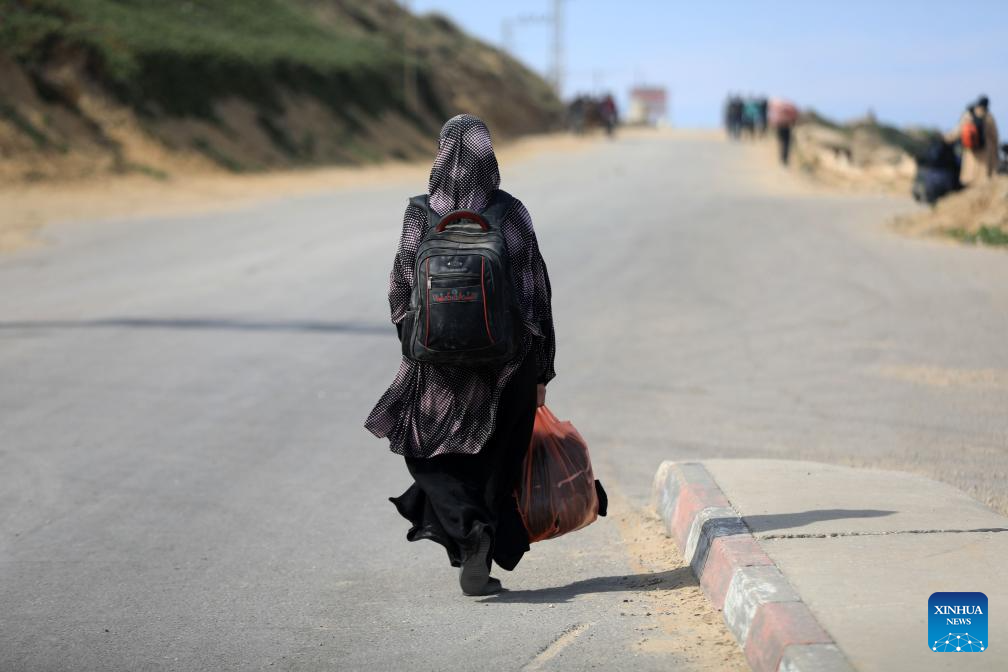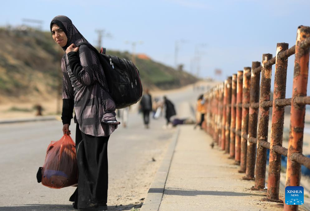 A Palestinian fleeing from Gaza City arrives in the central Gaza Strip, on March 25, 2024. The Palestinian death toll in the Gaza Strip from ongoing Israeli attacks has risen to 32,333, the Hamas-run Health Ministry said in a press statement on Monday. (Photo by Yasser Qudih/Xinhua)