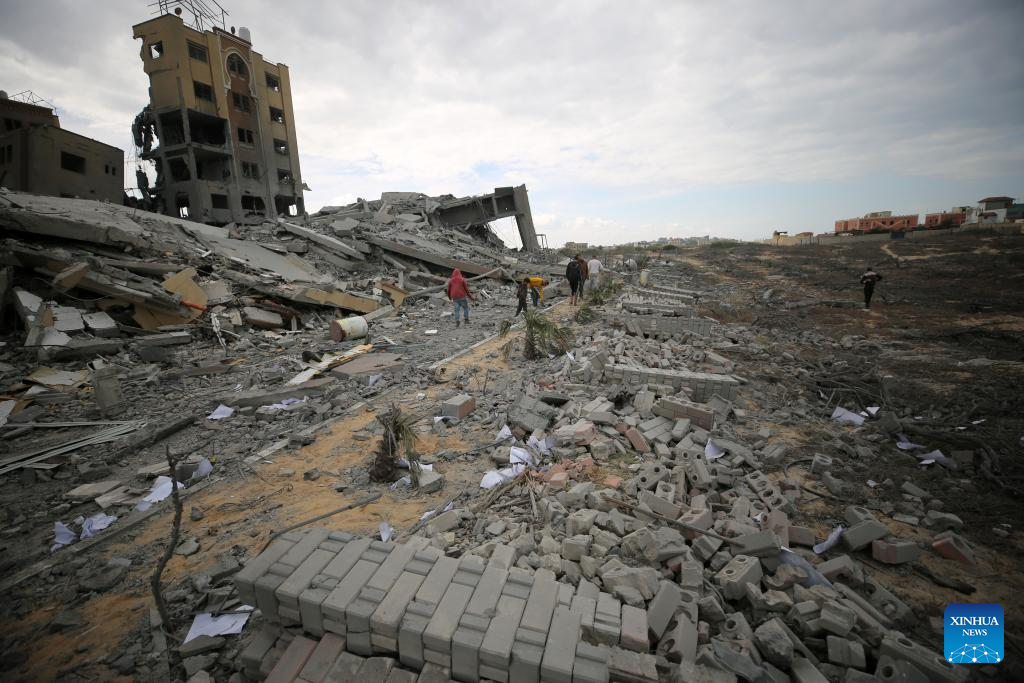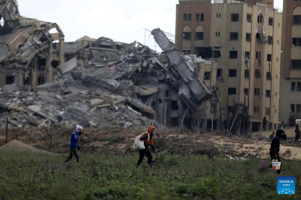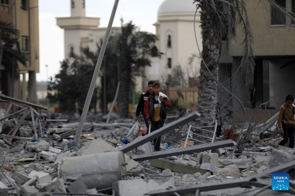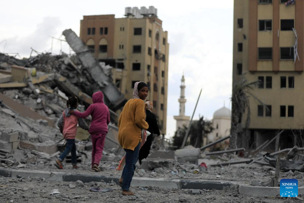 People walk past destroyed buildings in the central Gaza Strip, on March 25, 2024. The Palestinian death toll in the Gaza Strip from ongoing Israeli attacks has risen to 32,333, the Hamas-run Health Ministry said in a press statement on Monday. (Photo by Yasser Qudih/Xinhua)