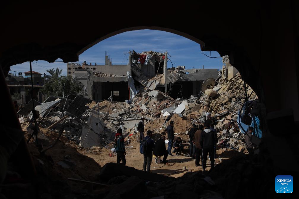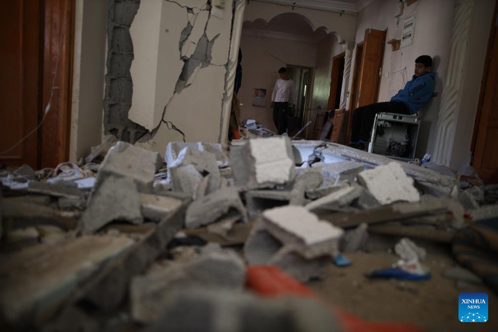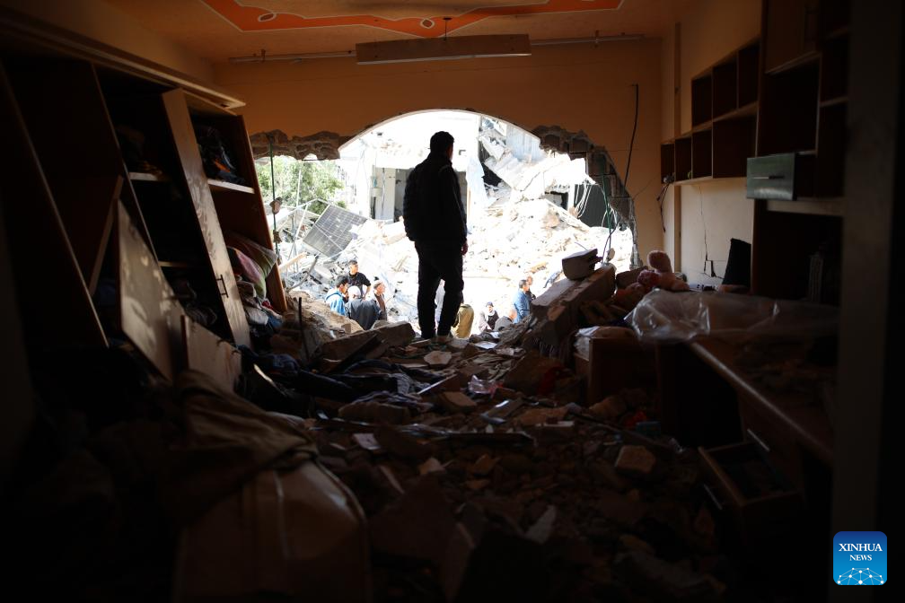 People inspect the damage after Israeli strikes in central Gaza Strip city of Deir el-Balah, on March 25, 2024. The Palestinian death toll in the Gaza Strip from ongoing Israeli attacks has risen to 32,333, the Hamas-run Health Ministry said in a press statement on Monday. (Xinhua)