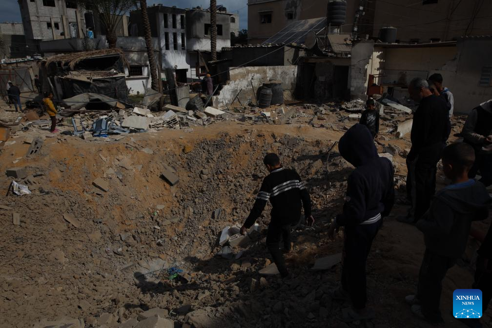 People are seen near a crater after Israeli strikes in central Gaza Strip city of Deir el-Balah, on March 25, 2024. The Palestinian death toll in the Gaza Strip from ongoing Israeli attacks has risen to 32,333, the Hamas-run Health Ministry said in a press statement on Monday. (Xinhua)