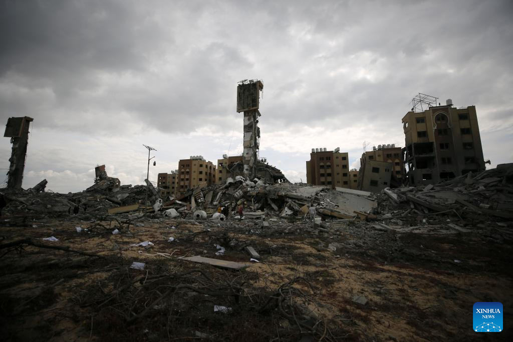 People are seen near destroyed buildings in the central Gaza Strip, on March 25, 2024. The Palestinian death toll in the Gaza Strip from ongoing Israeli attacks has risen to 32,333, the Hamas-run Health Ministry said in a press statement on Monday. (Photo by Yasser Qudih/Xinhua)