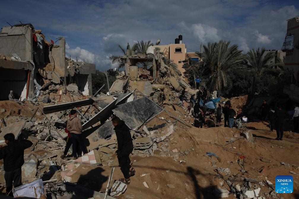 People walk among the rubble in the central Gaza Strip, on March 25, 2024. The Palestinian death toll in the Gaza Strip from ongoing Israeli attacks has risen to 32,333, the Hamas-run Health Ministry said in a press statement on Monday. (Photo by Yasser Qudih/Xinhua)