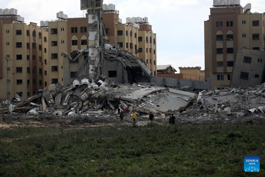 People are seen in front of destroyed buildings after Israeli strikes in central Gaza Strip city of Deir el-Balah, on March 25, 2024. The Palestinian death toll in the Gaza Strip from ongoing Israeli attacks has risen to 32,333, the Hamas-run Health Ministry said in a press statement on Monday. (Xinhua)