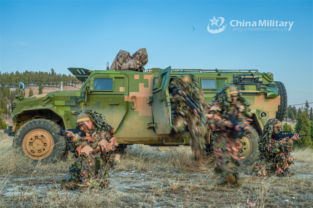 Soldiers in ghillie suits assigned to a reconnaissance detachment of a brigade under the PLA 71st Group Army get off the armored vehicle and stay alert during a training exercise in mid-March, 2024. (eng.chinamil.com.cn/Photo by Wan Zhiqi)