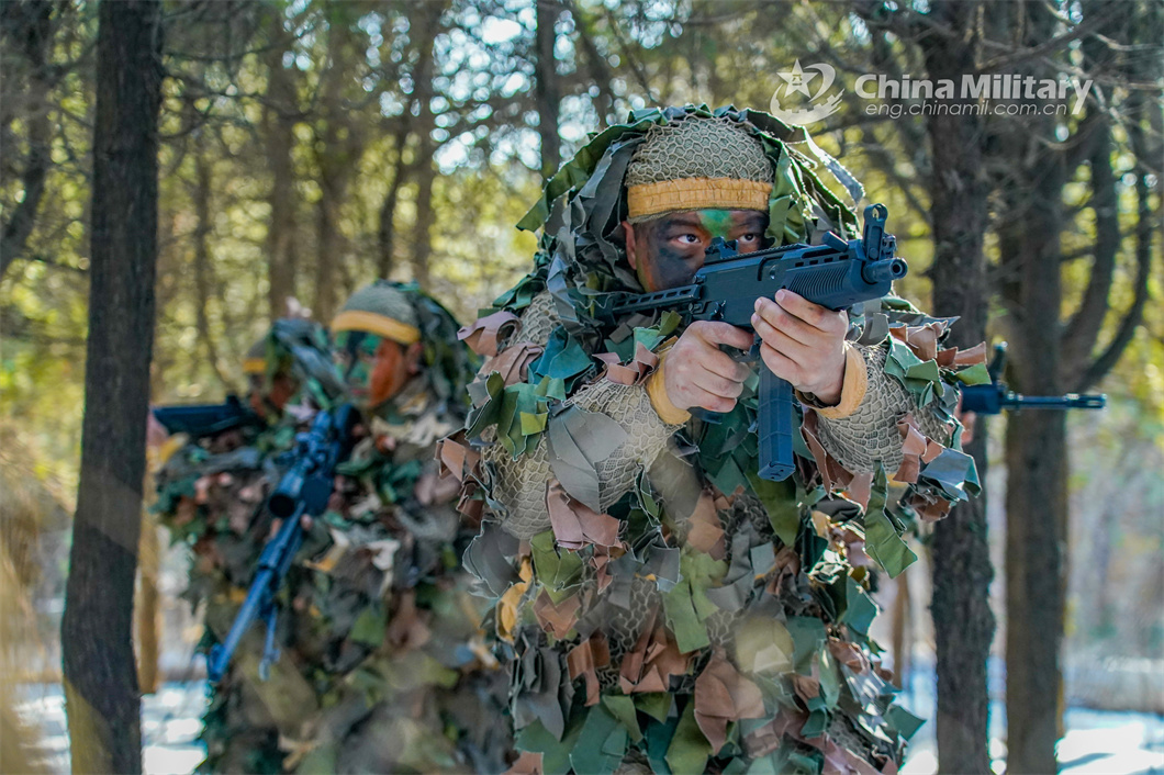 Soldiers in ghillie suits assigned to a reconnaissance detachment of a brigade under the PLA 71st Group Army explore the woods with caution during a training exercise in mid-March, 2024. (eng.chinamil.com.cn/Photo by Wan Zhiqi)