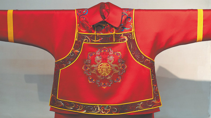 A wedding garment made by Fu Xianghong for her grandchild. It was a tradition that mothers should make wedding clothes with exquisite embroidery for their daughters. [Photo by Gao Erqiang/China Daily]