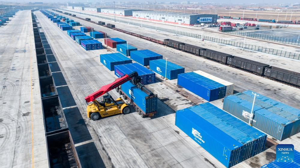 Staff members check the containers at the Qisumu international railway logistics hub in Ulanqab, north China's Inner Mongolia Autonomous Region, on March 25, 2024. The Qisumu international railway logistics hub was officially put into operation in 2016. It is the biggest base of China-Europe freight trains in north China's Inner Mongolia Autonomous Region. A total of 745 outbound freight trains have been handled by the hub since its operation. The China-Europe freight train services handled by the hub currently reach 16 cities in Europe and Asia. (Xinhua/Lian Zhen)