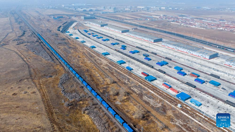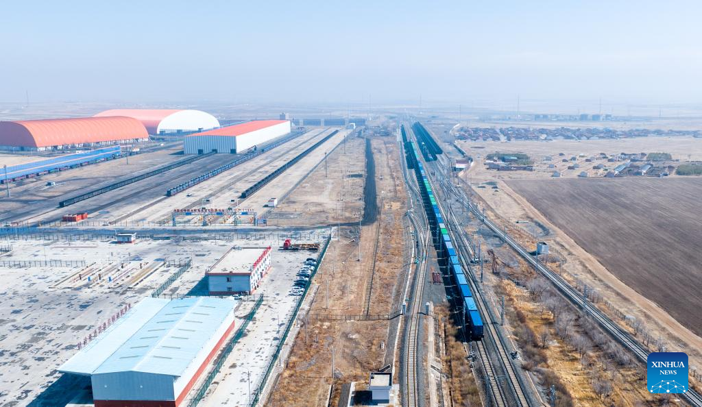 An aerial drone photo taken on March 25, 2024 show a China-Europe freight train running past the Qisumu international railway logistics hub in Ulanqab, north China's Inner Mongolia Autonomous Region. The Qisumu international railway logistics hub was officially put into operation in 2016. It is the biggest base of China-Europe freight trains in north China's Inner Mongolia Autonomous Region. A total of 745 outbound freight trains have been handled by the hub since its operation. The China-Europe freight train services handled by the hub currently reach 16 cities in Europe and Asia. (Xinhua/Lian Zhen)
