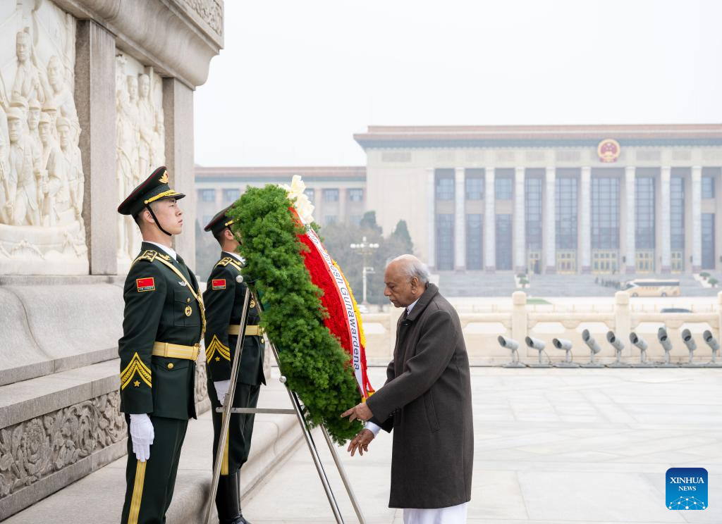 Sri Lankan Prime Minister Dinesh Gunawardena lays a wreath at the Monument to the People's Heroes on the Tian'anmen Square in Beijing, capital of China, March 26, 2024. (Xinhua/Zhai Jianlan)