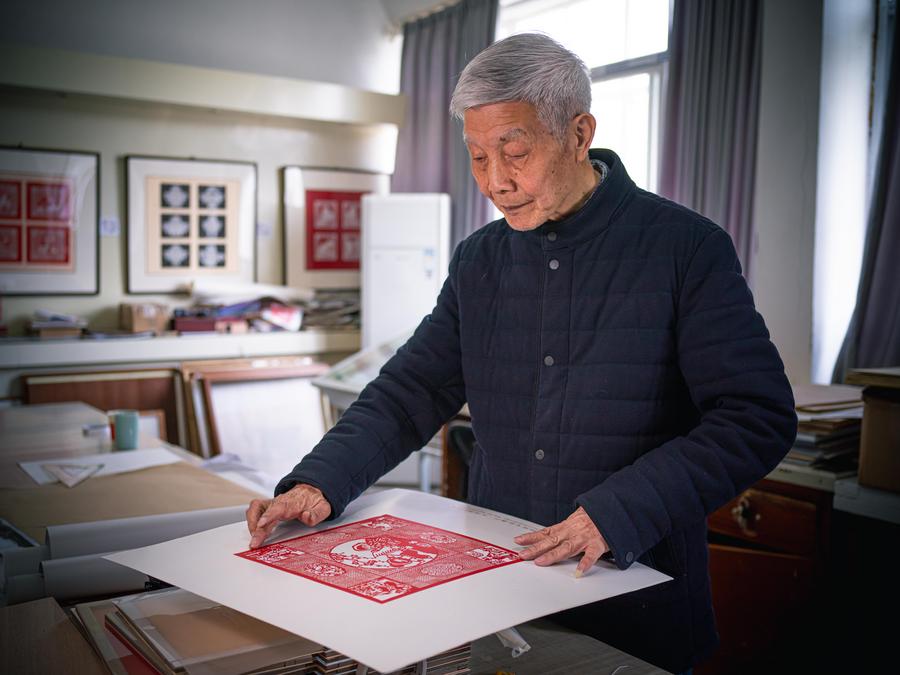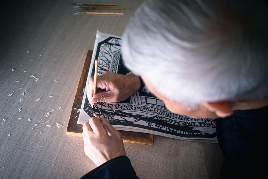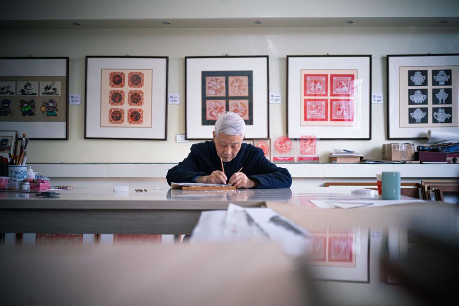 Lu Faliang mounts a paper knife cutting at his studio in Yueqing City, east China's Zhejiang Province, March 12, 2024. (Xinhua/Jiang Han)