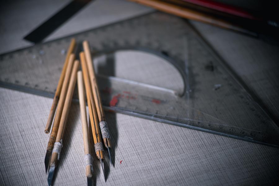 This photo taken on March 12, 2024 shows tools that Lu Faliang uses for making paper knife cuttings in Yueqing City, east China's Zhejiang Province. (Xinhua/Jiang Han)