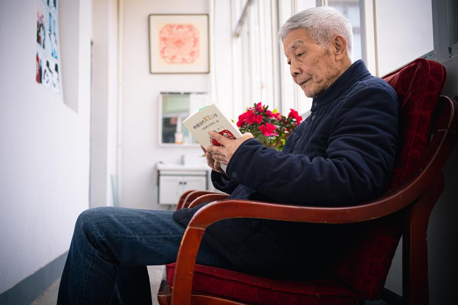 Lu Faliang reads in search of inspirations for his new paper knife cutting works at his studio in Yueqing City, east China's Zhejiang Province, March 12, 2024. (Xinhua/Jiang Han)