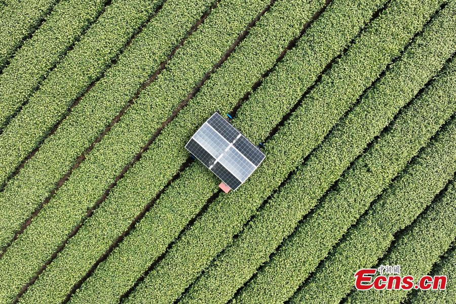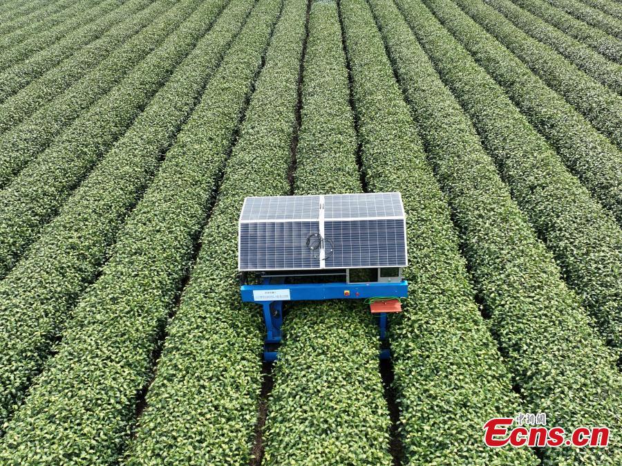 The AI tea picking robot was put into use in a tea garden. With a sun hat made of solar panels, a tea-picking robot weaved through rows of Longjing tea bushes in Hangzhou.