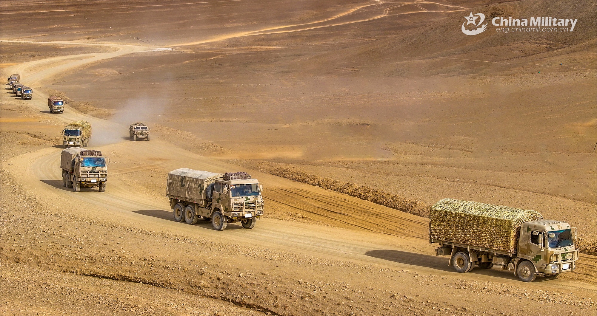 A convoy of military trucks attached to a regiment under the PLA Army is en route to a designated training field during a driving skill training exercise in desert area on March 14, 2024. (eng.chinamil.com.cn/Photo by Shang Luhang)