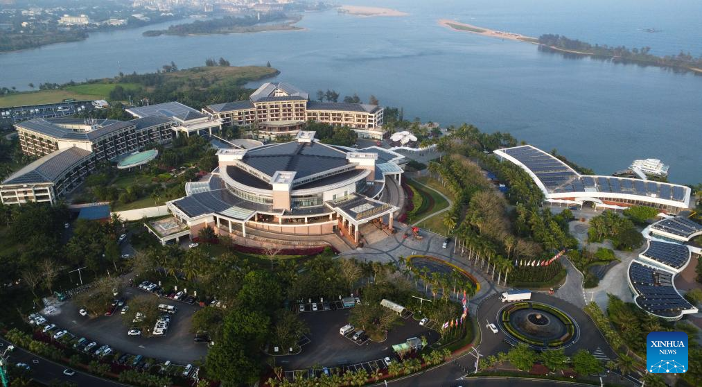 An aerial drone photo taken on March 17, 2024 shows the Boao Forum for Asia (BFA) International Conference Center after renovation in the Boao near-zero carbon demonstration zone in Boao, south China's Hainan Province. The Boao near-zero carbon demonstration zone was put into operation before Boao Forum for Asia (BFA) Annual Conference 2024.