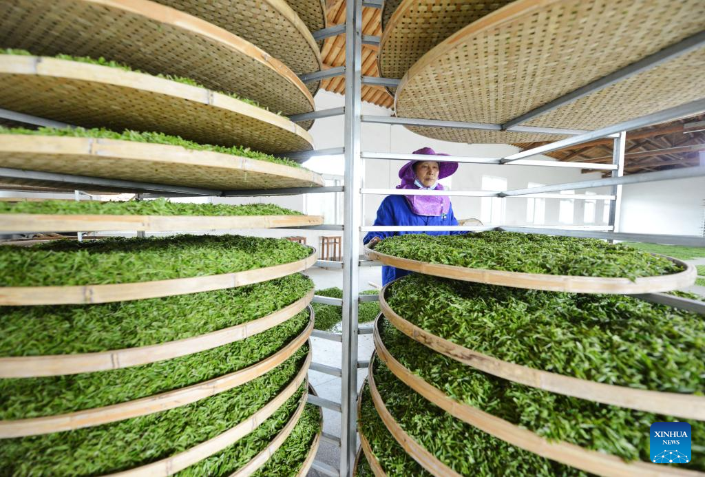 A worker processes tea leaves at a tea processing enterprise in Chaohu City, east China's Anhui Province, March 28, 2024. Tea farmers and enterprises are busy harvesting and processing spring tea leaves to meet the consumer demand lately. (Photo by Ma Fengcheng/Xinhua)